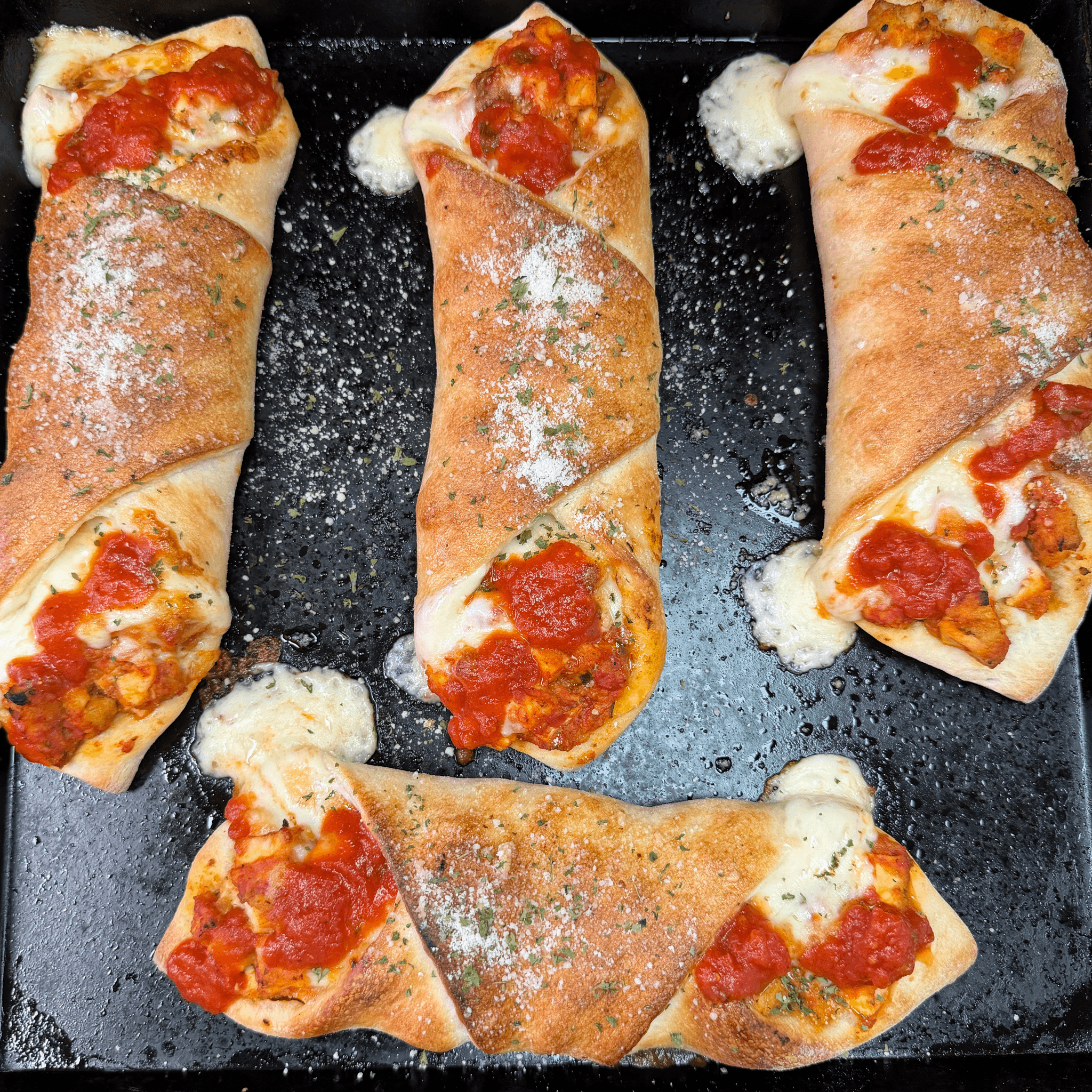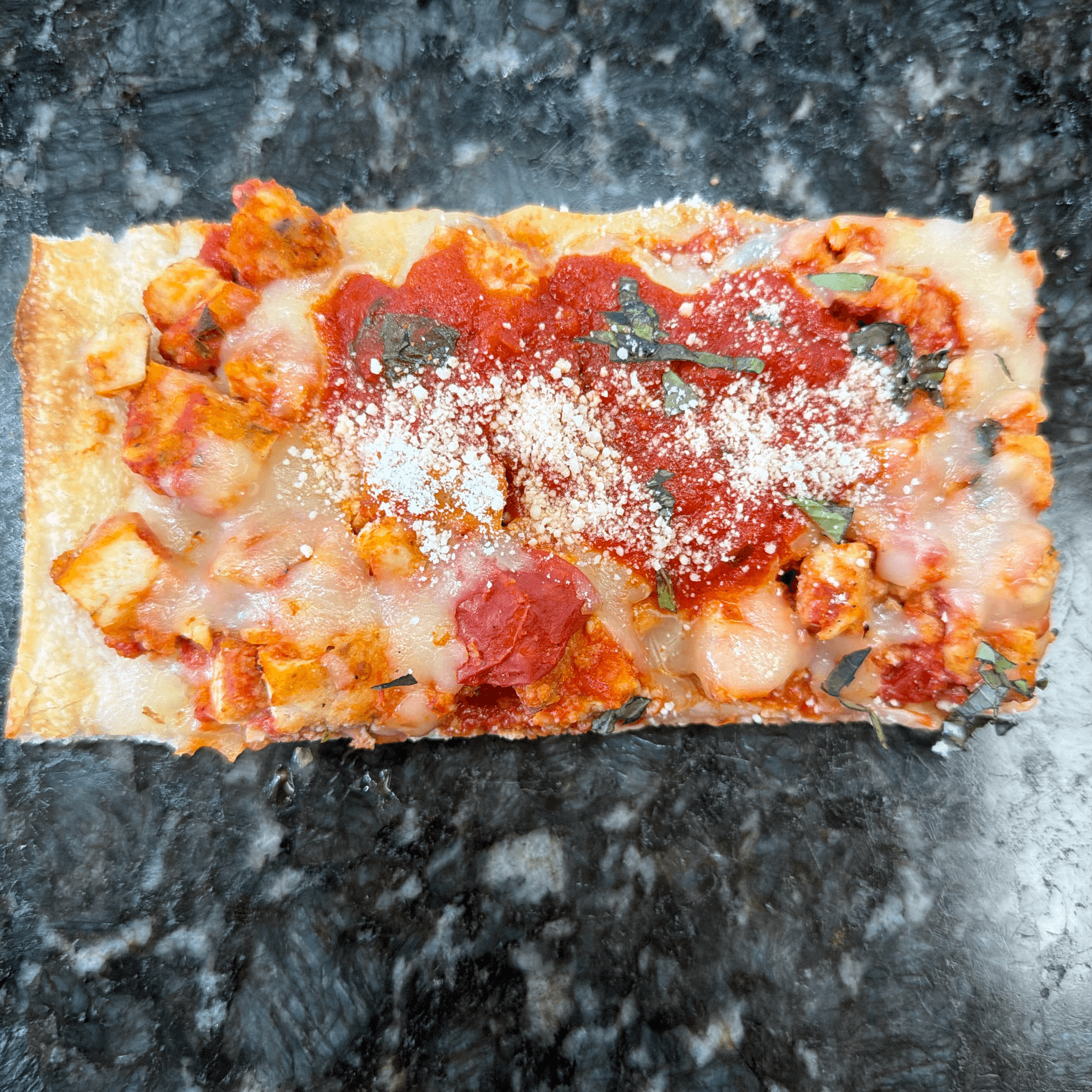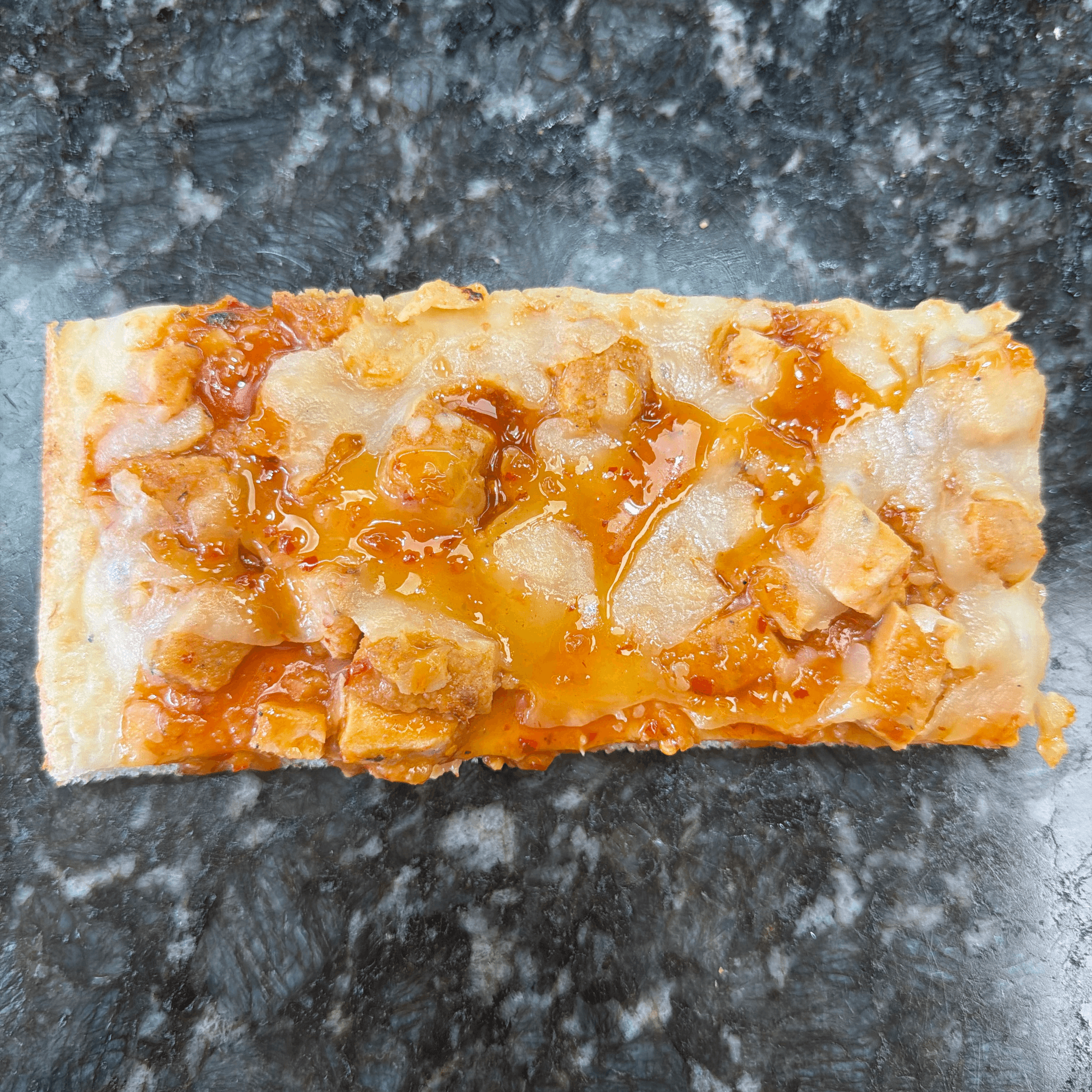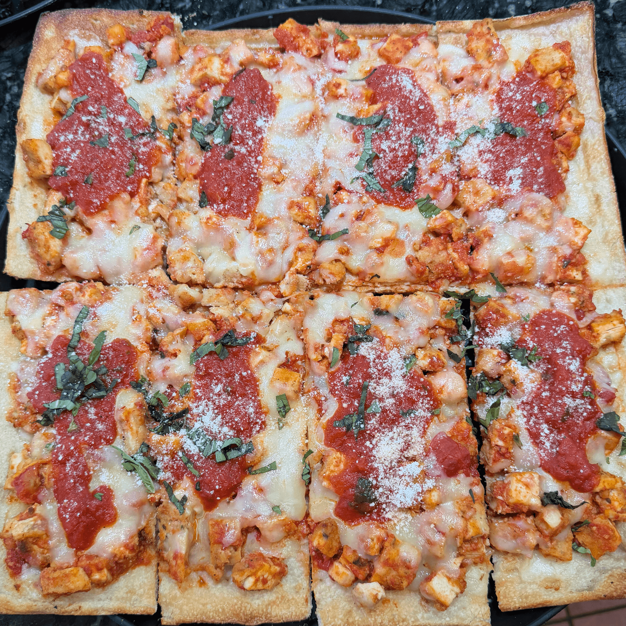 Diced chicken, tomato sauce and Mozzarella cheese