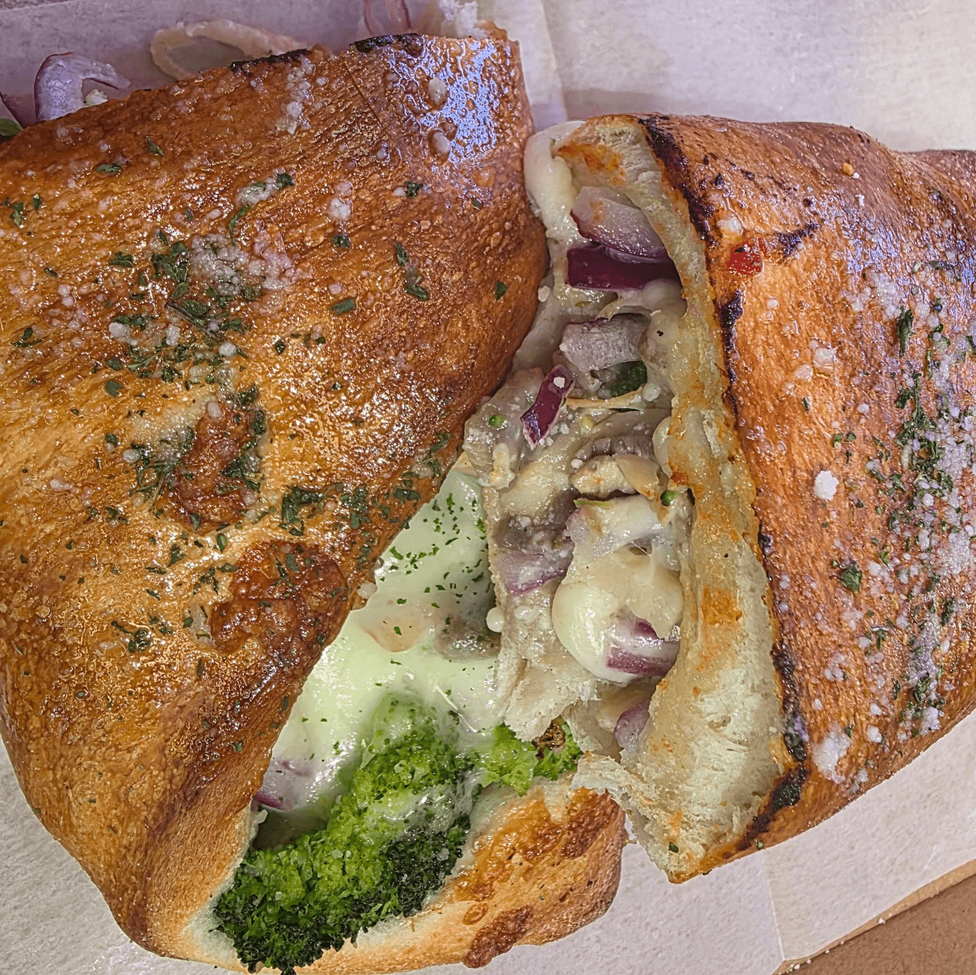 Broccoli, onions, mushrooms & Mozzarella cheese