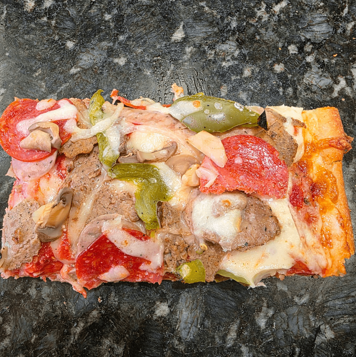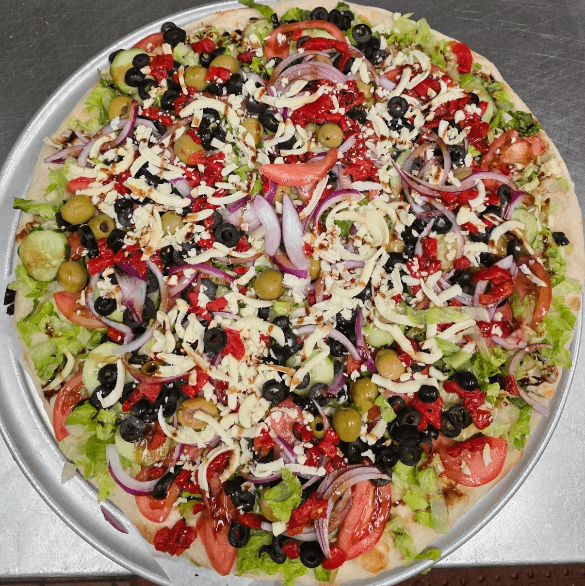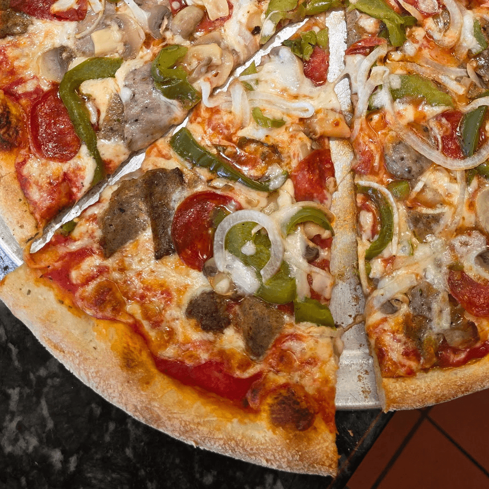 Premium Mozzarella, mushrooms, onions, green peppers, black olives & tomatoes