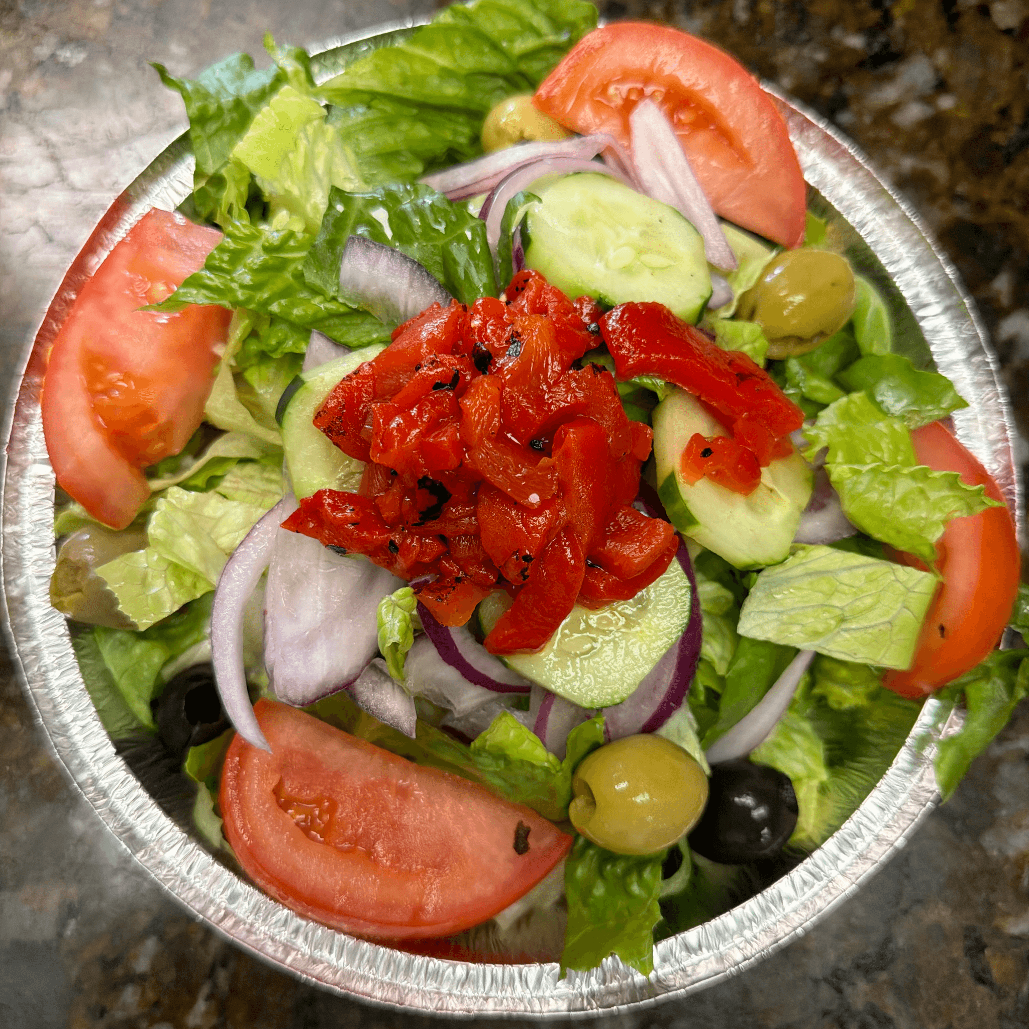 Mixed greens, tomatoes, cucumbers, peppers, red onions & olives