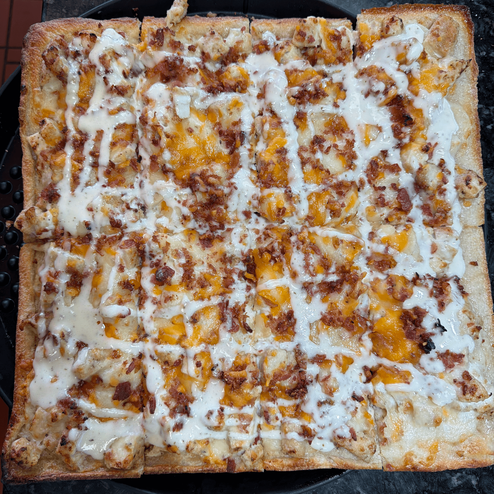 Large 18". Mozzarella cheese, bacon, chicken & yummy ranch dressing