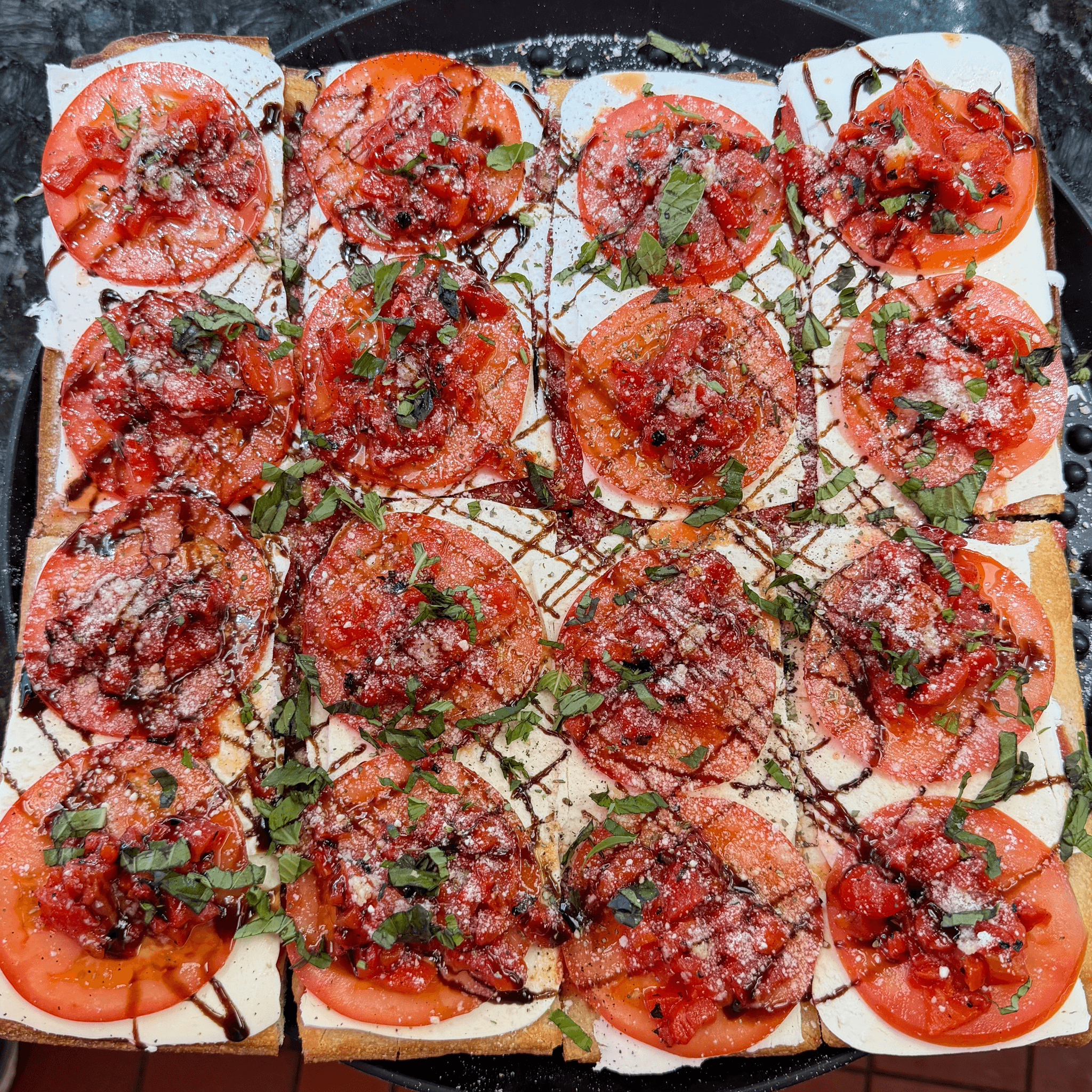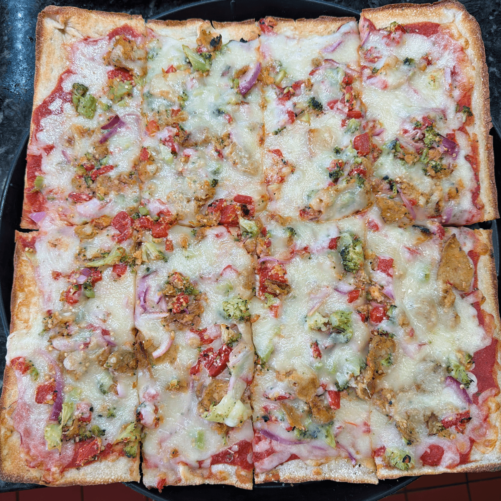 Large 18". Premium Mozzarella, mushrooms, red onions, roasted red peppers, eggplant, broccoli